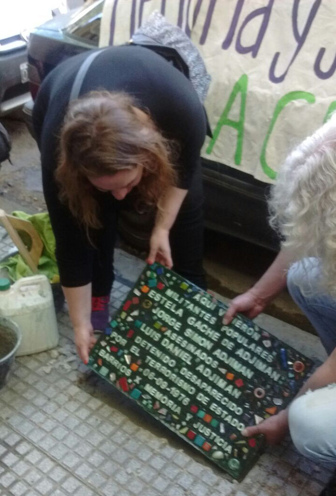 Hacer la baldosa y colocarla en comunidad es uno de de los más bellos rituales y recordatorios no solo por su memoria sino por la de todo el pueblo. El 6 de setiembre de 1976, a la madrugada, asesinaron a mis padres Estela María Gache de Adjiman y Jorge Simón Adjiman, y secuestraron a mi tío Luis Daniel, para ser llevado a la ESMA y destinado a un vuelo de la muerte. Podría decir muchas cosas que no sé de ellos, muchas que investigué y otras que no. Que eran militantes de las FAR, que se resistieron por cuatro horas mientras mi abuela Hilda nos protegía con su cuerpo a mi hermana y a mí, que sobrevivimos no sé cómo, que no nos secuestraron no sé cómo, que seguimos insistiendo en la vida.