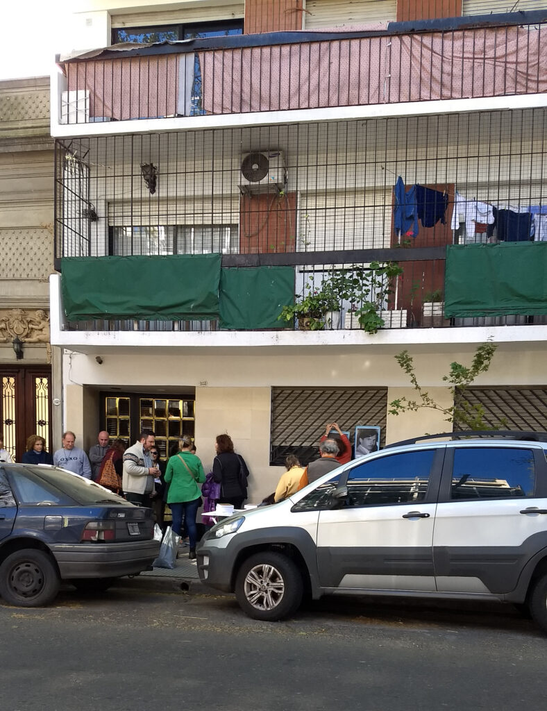 Estas emociones fueron descriptas por Ana Adjiman, hija de Estela y Jorge, sobrina de Luis. Ana no solo participó activamente en la confección y colocación de la baldosa por toda su familia, sino que además integra el grupo AVIVE! que viene realizando desde hace tiempo presentaciones performáticas en nuestro barrio y en otros, mientras se realizan recorridos por las baldosas y los vecinos y el público conocen así más sobre los compañeros desaparecidos.