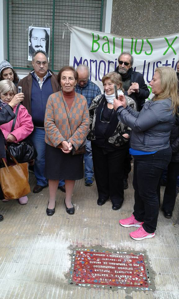 Colocamos una baldosa, junto a su hermana Emilia, otros familiares y amigos, frente a su casa de infancia, ubicada en Fraga 568, el 3 de junio de 2017.