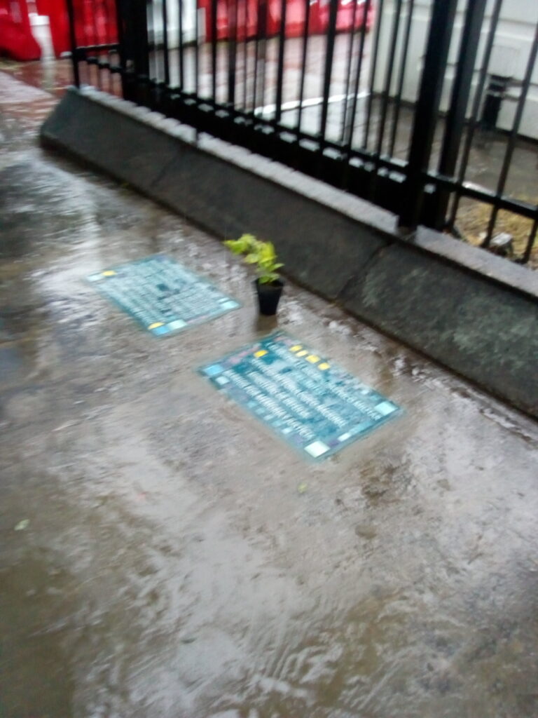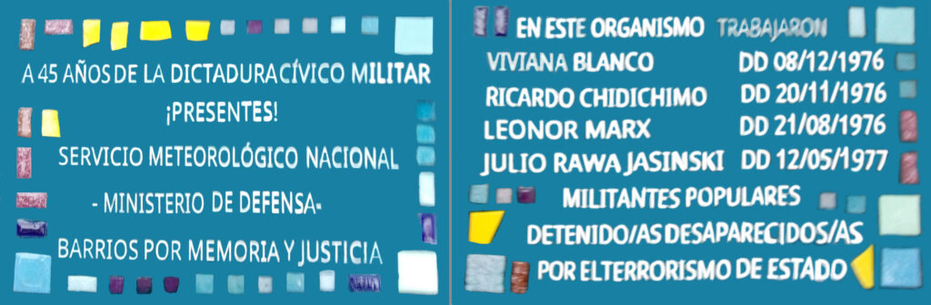 Con la presencia del entonces Ministro de Defensa, Agustín Rossi, y el titular de DD.HH. de esa cartera, Eduardo Jozami, se colocaron estas dos baldosas en la entrada del predio que ocupa el Servicio Meteorológico Nacional en Av. Dorrego 419, el 20/03/2021. Los compañeros recordados por la familia del Servicio Meteorológico son:
